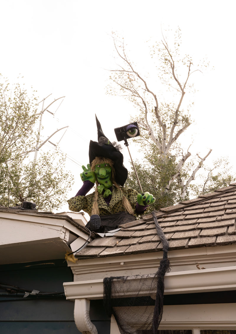 If you want a witch in motion, a motor is helpful. Our hula-hoop witch is a favorite at The Village, and she runs on a motor. (Shhh… don’t tell the kiddos! We wouldn’t want to ruin the magic.) If you have motorized displays, you’ll want to keep them in a covered area like a covered porch so they don’t get ruined in the fall weather.